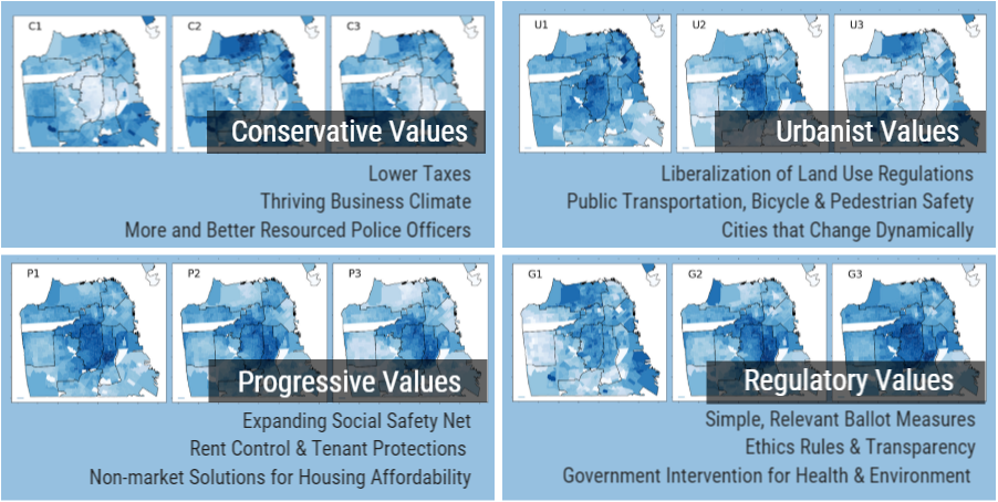 Drawn from public voting records over five years, our model offers precinct-by-precinct views of voting history on all ballot measures and city-wide candidate elections and identifies consistent concentrations of voter affinity at the neighborhood level.